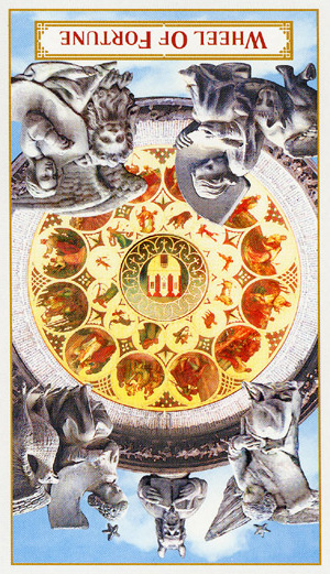 With the Wheel of Fortune, the second major cycle of Tarot commences. The first cycle in the first cards of the deck was about development as a child, accumulating wisdoms and integrating them into your personality. This second cycle is about your development as an adult. It is a more demanding cycle. You'll have to see if you can face what the world throws at you.