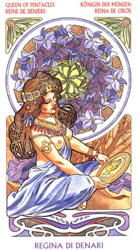 The Queen in the suit of Pentacles becomes aware of her Earthly attributes; she's reliable and sober, able to give good advice.