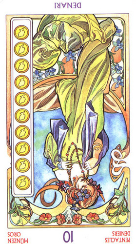 The 10 of Pentacles represents material posessions. The number 10 of Pentacles forms the links to the Ace (first card) of Wands (the first suit in the minor Arcana), and thus prepares to bring you back to the beginning of the minor Arcana, ready for a next cycle through the tarot.