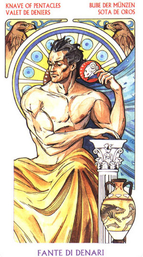 Pages explore and gather information about the road ahead, with an almost naive attitude. The Page of Pentacles is sometimes described as a bridge builder; Pentacles is the suit where the actual work is done, and the Page here enables those that follow to quickly cross difficult terrain.
