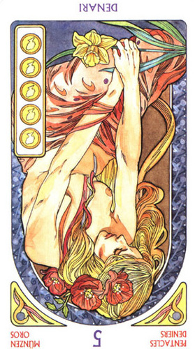 The 5 of Pentacles is an assignment-number card, and is about letting go of your securities. Pentacles element Earth (also) represents material posessions, so this card is about letting go of (some of) your worldly assets.