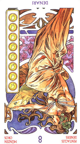 The 8 of Pentacles is about keeping up the hard work you're doing, and trying to be happy about doing that work at the same time. While the 3 of Pentacles is about completing a masterpiece, the 8 of Pentacles is about doing the apprentice work that makes you a master of your trade.