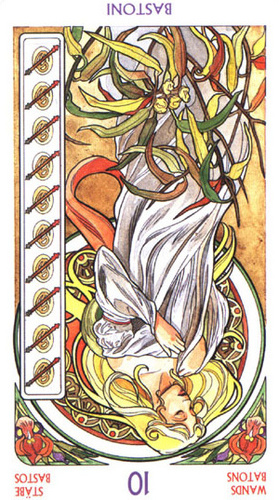 The 10 of Wands is therefore the transition from the element Fire (associated with Wands) to the element Water, associated with Cups. As you might imagine, this not the easiest of transitions.