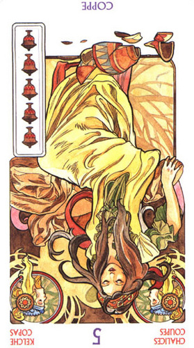 The 5 of Cups is about overcoming sadness and disappointment. You've let go of your old securities to embrace the new and exciting, now something has gone awry and you feel bad about that. But don't forget to notice those things that did go right.