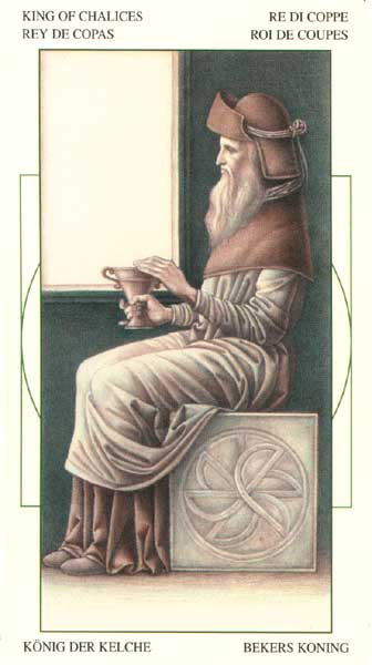 The King of Cups uses his intuition to achieve his ideals. Since Cups are turned inward, and Kings turned to the outside world, this card might be a difficult one, or it could be a powerful one.