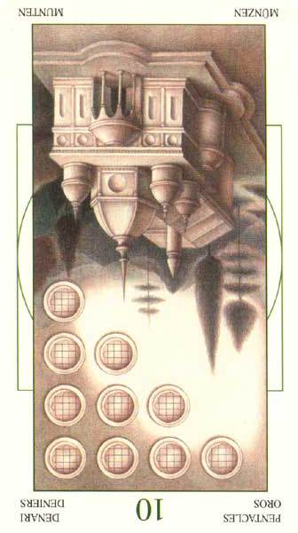 The 10 of Pentacles represents material posessions. The number 10 of Pentacles forms the links to the Ace (first card) of Wands (the first suit in the minor Arcana), and thus prepares to bring you back to the beginning of the minor Arcana, ready for a next cycle through the tarot.