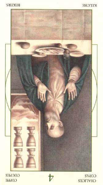 With the 4, the second cycle of this suit is commenced, where a choice between structure and feeling has to be made, where old securities have to be let go of to work towards a new future. But like Wands, Cups don't like structure much, they prefer to be free and dream rather than to make commitments and go for something.