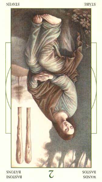 The 2 of Wands represents the research and digestion of a new idea. The number of this card and it's element are somewhat in conflict; while the 2 is focussed inwards, the Wand's element fire is outgoing. Fire wants to steam ahead while the blackbox 2 asks for patience.