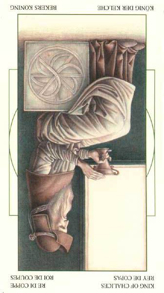 The King of Cups uses his intuition to achieve his ideals. Since Cups are turned inward, and Kings turned to the outside world, this card might be a difficult one, or it could be a powerful one.