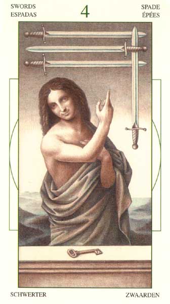 4 is the first number in the cycle of giving things shape. It's about making things real. The element of Swords also relates to making things real, so this enhances the effect so much that arrogance can cause you to exhaust yourself.