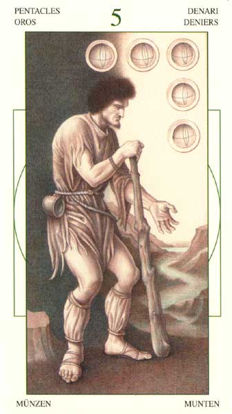 The 5 of Pentacles is an assignment-number card, and is about letting go of your securities. Pentacles element Earth (also) represents material posessions, so this card is about letting go of (some of) your worldly assets.