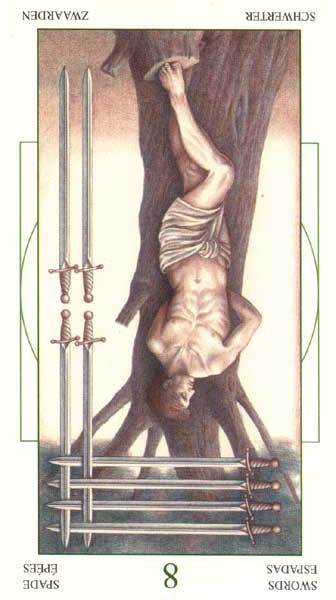 The 8 of Swords is about slowly regaining strength and energy. The 8 is an assignment number, and in the element of Swords it's a bit harder than usual.