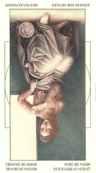 The Queen in the suit of Pentacles becomes aware of her Earthly attributes; she's reliable and sober, able to give good advice.