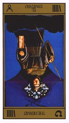 The Hermit shuts out the world and retreats into solitude to better understand some spiritual aspect of life. He opens to the cosmos and lets it's wisdom sink in. Hermits are often seen as wise old men who can guide a traveller along a journey.
