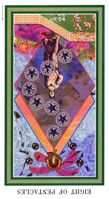 The 8 of Pentacles is about keeping up the hard work you're doing, and trying to be happy about doing that work at the same time. While the 3 of Pentacles is about completing a masterpiece, the 8 of Pentacles is about doing the apprentice work that makes you a master of your trade.