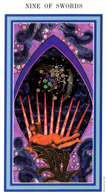 The 9 of Swords represents relief from cropped-up grief. The number 9 is a number of reward and rest and accomplishment. In the element of Swords there is not a lot of time for rest, but without any rest you'd just burn yourself out.