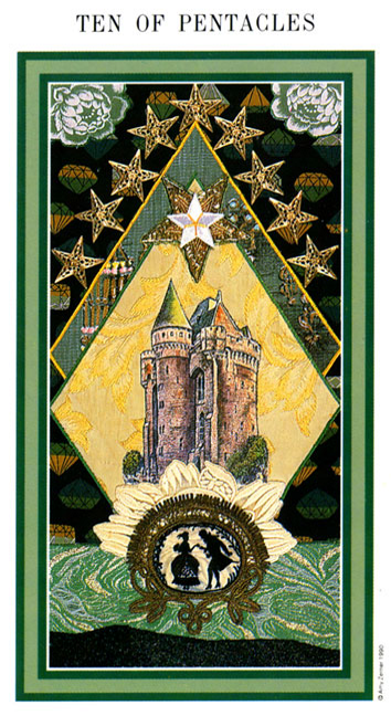 The 10 of Pentacles represents material posessions. The number 10 of Pentacles forms the links to the Ace (first card) of Wands (the first suit in the minor Arcana), and thus prepares to bring you back to the beginning of the minor Arcana, ready for a next cycle through the tarot.