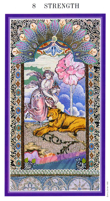 This card carries the number 11. In the Rider-Waite deck, Strength and Justice have swapped places because Waite saw links with the astrological signs Leo and Libra.