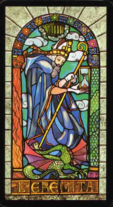 The Hermit shuts out the world and retreats into solitude to better understand some spiritual aspect of life. He opens to the cosmos and lets it's wisdom sink in. Hermits are often seen as wise old men who can guide a traveller along a journey.