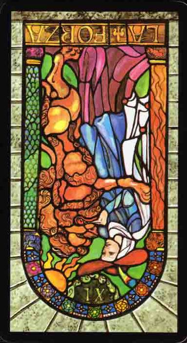 This card carries the number 11. In the Rider-Waite deck, Strength and Justice have swapped places because Waite saw links with the astrological signs Leo and Libra.