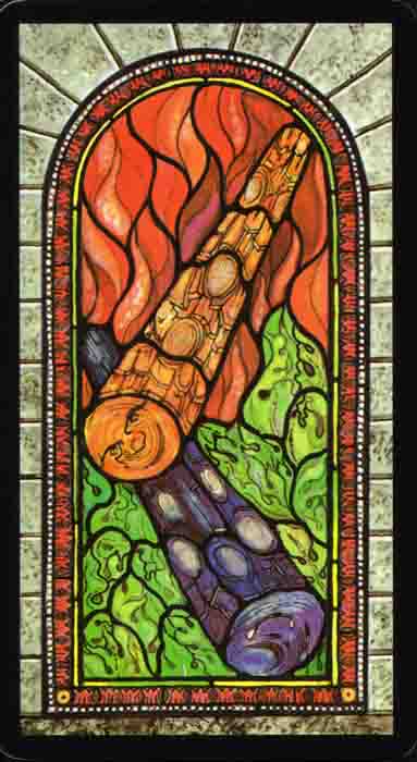 The 2 of Wands represents the research and digestion of a new idea. The number of this card and it's element are somewhat in conflict; while the 2 is focussed inwards, the Wand's element fire is outgoing. Fire wants to steam ahead while the blackbox 2 asks for patience.