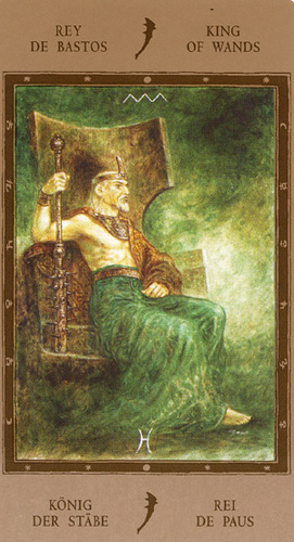 The King of Wands uses the properties of Wands (vitality, optimism, enthousiasm) to go out with confidence. He is seen as a leader with charisma.