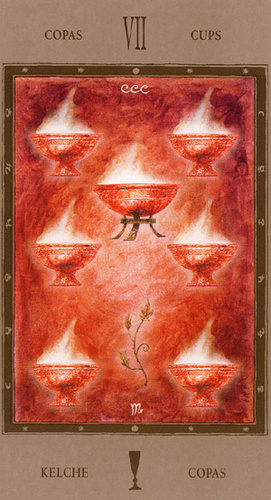The 7 of Cups is about making a choice between different ideals. But Cups, with the water element, don't like making definitive choices that much, making this 7 in this suit a bit of a hard choice.