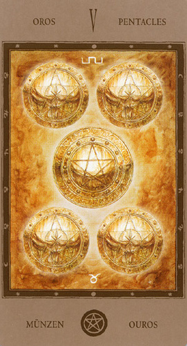 The 5 of Pentacles is an assignment-number card, and is about letting go of your securities. Pentacles element Earth (also) represents material posessions, so this card is about letting go of (some of) your worldly assets.