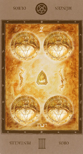 The 4 of Pentacles is about holding on to what you got. The number 4 represents structure and order, and fits well with the suit's element, Earth.