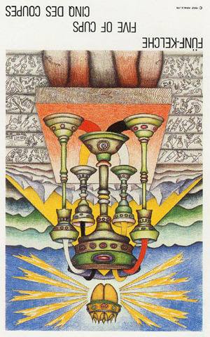 The 5 of Cups is about overcoming sadness and disappointment. You've let go of your old securities to embrace the new and exciting, now something has gone awry and you feel bad about that. But don't forget to notice those things that did go right.