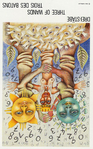 This card is about exposing your new ideas to the world. The Wand's element fire goes well with the number 3, as 3 is an output number, a number of results. Fire likes getting to results quickly.
