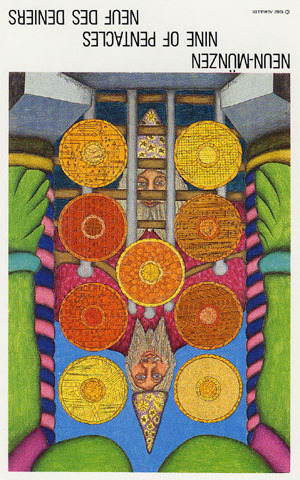 The 9 of Pentacles represents earned rest. The element Earth, attached to the Pentacles suit, appreciates the rest that completion of hard work brings. This is a good time for games and relaxation.