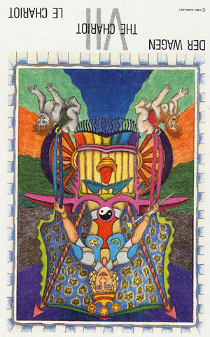 During the prevous card, The Lovers, all the wisdom of the first cards in the deck has been processed and a choice was made for personal growth. Now it's time to do something with all this baggage, to actually travel the road. A lot has been done so far, wisdoms have been accumulated and integrated into one's personality.