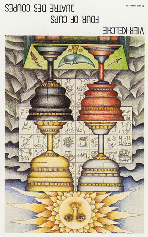 With the 4, the second cycle of this suit is commenced, where a choice between structure and feeling has to be made, where old securities have to be let go of to work towards a new future. But like Wands, Cups don't like structure much, they prefer to be free and dream rather than to make commitments and go for something.