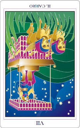 During the prevous card, The Lovers, all the wisdom of the first cards in the deck has been processed and a choice was made for personal growth. Now it's time to do something with all this baggage, to actually travel the road. A lot has been done so far, wisdoms have been accumulated and integrated into one's personality.