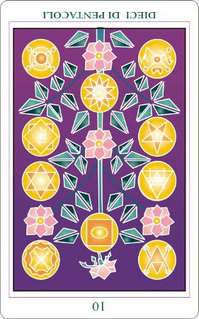 The 10 of Pentacles represents material posessions. The number 10 of Pentacles forms the links to the Ace (first card) of Wands (the first suit in the minor Arcana), and thus prepares to bring you back to the beginning of the minor Arcana, ready for a next cycle through the tarot.