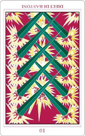 The 10 of Wands is therefore the transition from the element Fire (associated with Wands) to the element Water, associated with Cups. As you might imagine, this not the easiest of transitions.