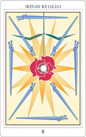 The 8 of Swords is about slowly regaining strength and energy. The 8 is an assignment number, and in the element of Swords it's a bit harder than usual.