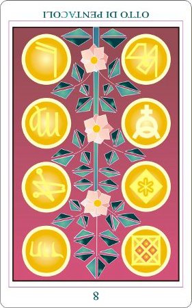 The 8 of Pentacles is about keeping up the hard work you're doing, and trying to be happy about doing that work at the same time. While the 3 of Pentacles is about completing a masterpiece, the 8 of Pentacles is about doing the apprentice work that makes you a master of your trade.