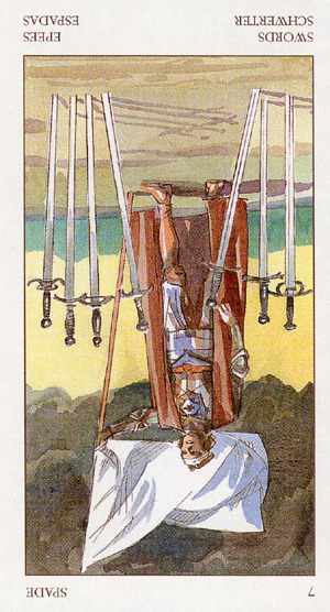The 7 of Swords is about making slow progress because you can't trust the situation and/or people around you.