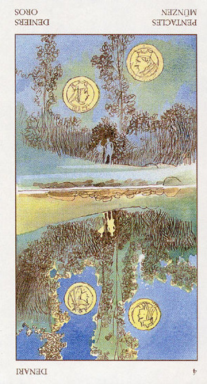 The 4 of Pentacles is about holding on to what you got. The number 4 represents structure and order, and fits well with the suit's element, Earth.