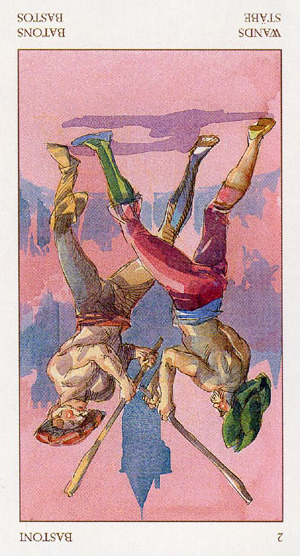 The 2 of Wands represents the research and digestion of a new idea. The number of this card and it's element are somewhat in conflict; while the 2 is focussed inwards, the Wand's element fire is outgoing. Fire wants to steam ahead while the blackbox 2 asks for patience.