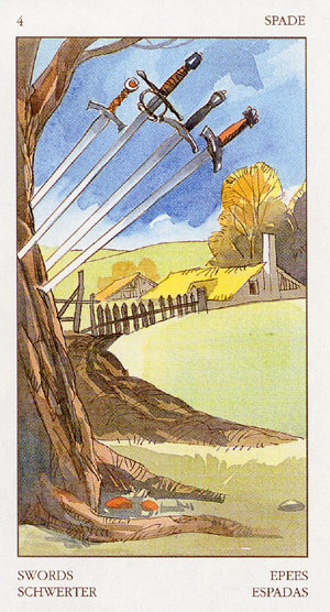 4 is the first number in the cycle of giving things shape. It's about making things real. The element of Swords also relates to making things real, so this enhances the effect so much that arrogance can cause you to exhaust yourself.