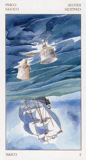 This the first assignment number of the Cups suit. Unlike Wands, with the Fire element, Cups, with the water element, has a lot more patience. Water is by nature more introspective, and this second card in the Cups suit is indeed about exploring yourself. The outcome is uncertain as always, but it usually results in better acceptance of yourself.