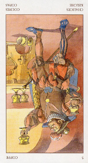 The 5 of Cups is about overcoming sadness and disappointment. You've let go of your old securities to embrace the new and exciting, now something has gone awry and you feel bad about that. But don't forget to notice those things that did go right.
