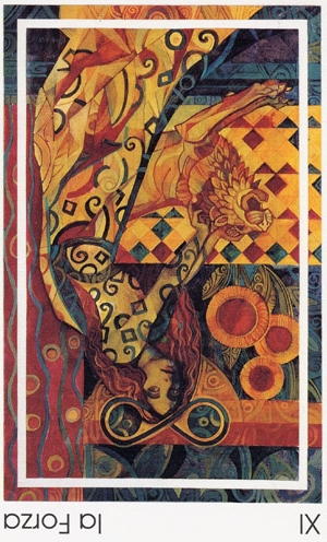 This card carries the number 11. In the Rider-Waite deck, Strength and Justice have swapped places because Waite saw links with the astrological signs Leo and Libra.