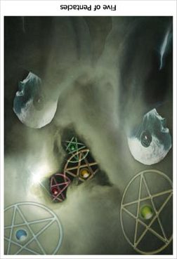 The 5 of Pentacles is an assignment-number card, and is about letting go of your securities. Pentacles element Earth (also) represents material posessions, so this card is about letting go of (some of) your worldly assets.
