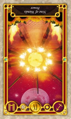 The 9 represents rest after work, which is another thing (like 8) that the element Fire associated with Wands is not very comfortable with. Fire likes to keep going. This rest will probably be spent thinking about what to do next along the course to completion.