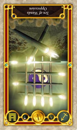 The 10 of Wands is therefore the transition from the element Fire (associated with Wands) to the element Water, associated with Cups. As you might imagine, this not the easiest of transitions.