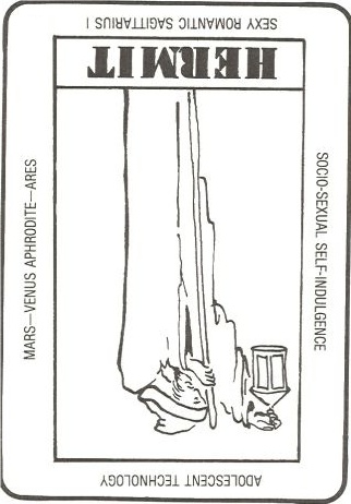 The Hermit shuts out the world and retreats into solitude to better understand some spiritual aspect of life. He opens to the cosmos and lets it's wisdom sink in. Hermits are often seen as wise old men who can guide a traveller along a journey.
